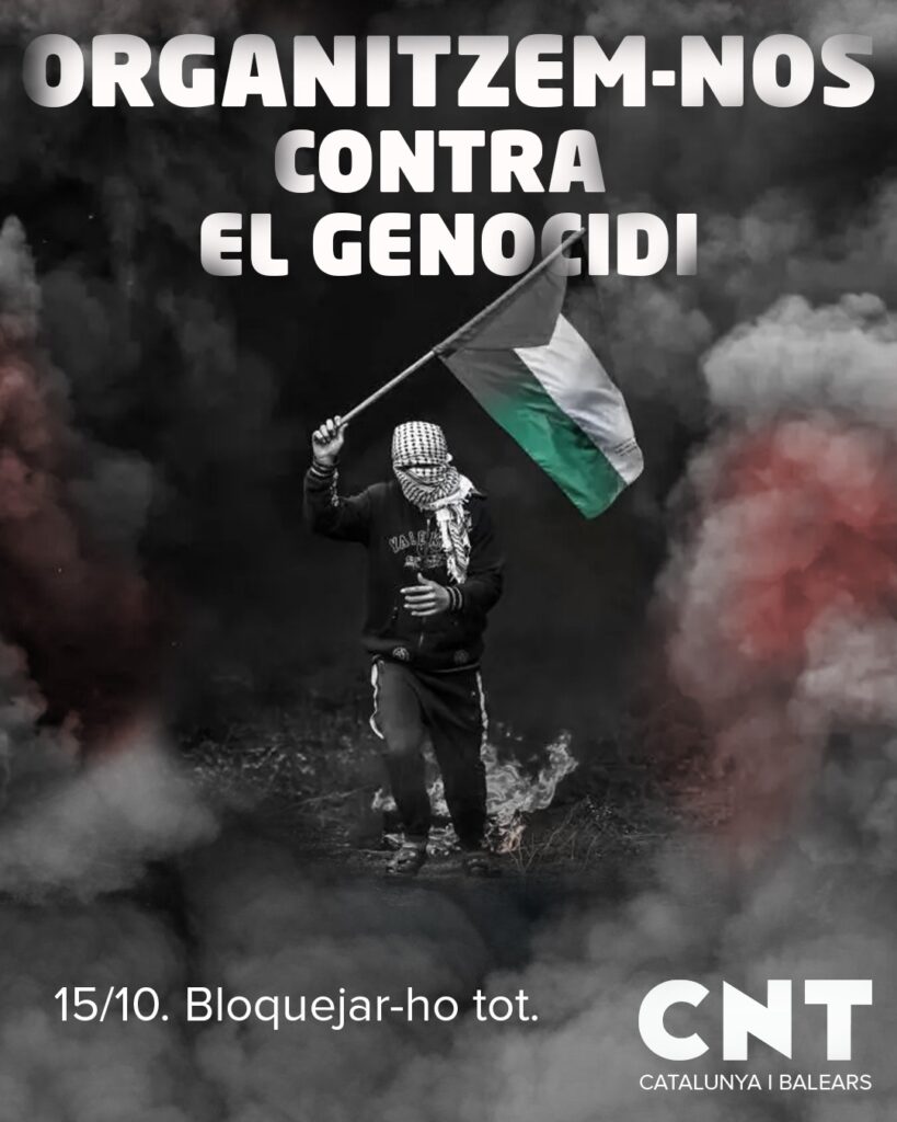 Des de la CNT de Catalunya i Balears, i en el context de l’agreujament de la situació a Gaza, Cisjordània i de l’atac a la Flotilla de Gaza, fem una crida urgent a la nostra afiliació, a la classe treballadora general i totes les persones solidàries a sumar-se i participar activament en totes les convocatòries de protesta que tindran lloc aquest proper 15 d’octubre.