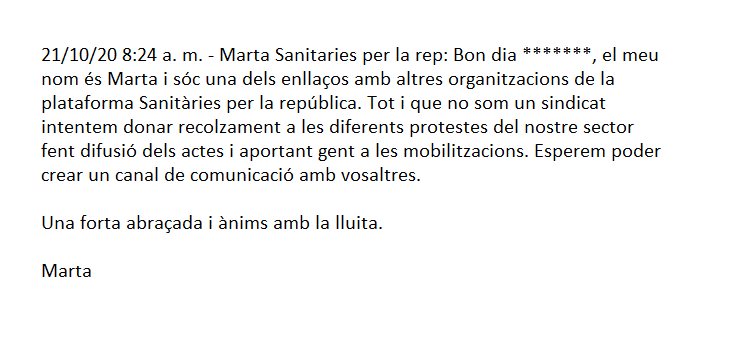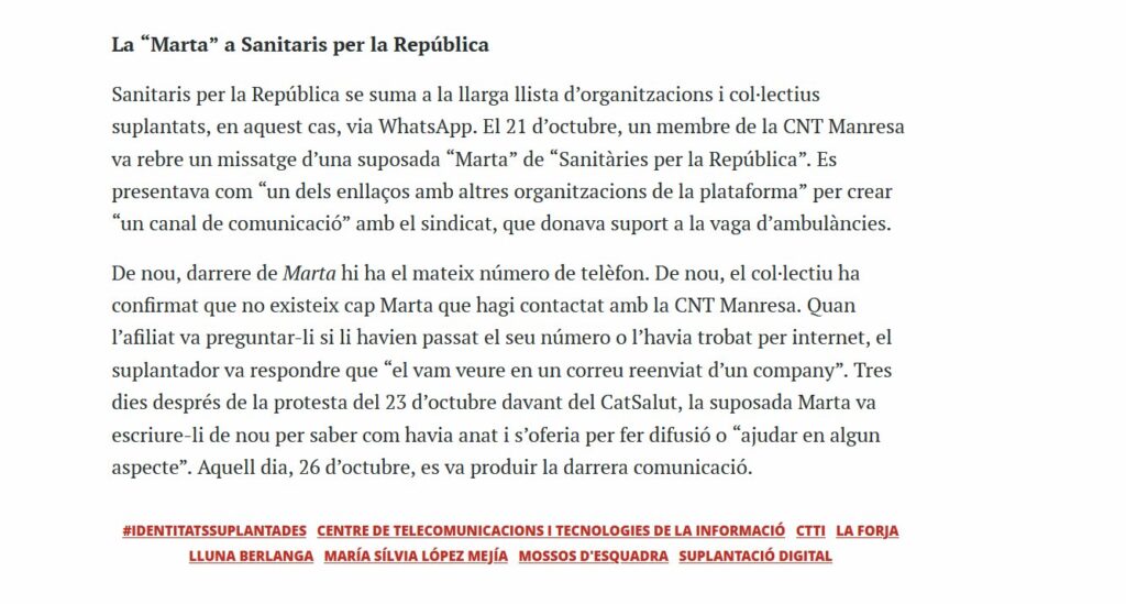 En el nostre cas particular, de la CNT de Manresa, a l’octubre del 2020, en el context de la vaga d’ambulàncies, ens van contactar des d’un telèfon al darrara del qual s’hi identificava una tal “Marta Sanitaris x la República”. Aquesta notícia va sortir el 2021 també a La Directa: